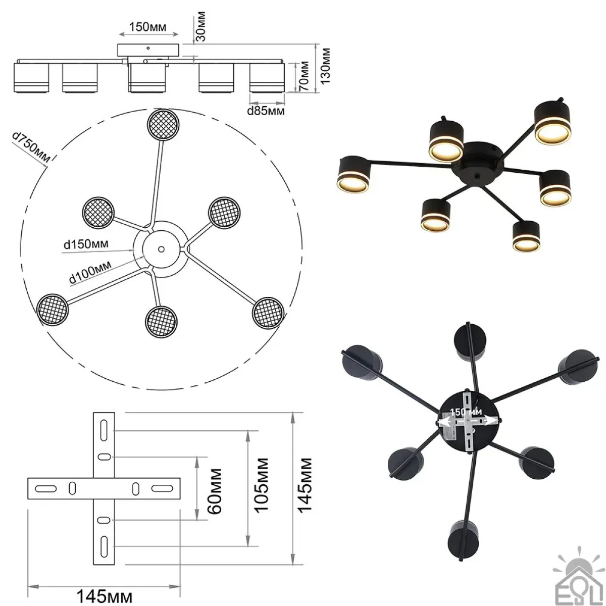 Люстра GELA 6R 750x130 мм Чорна на 6 ламп GX53 10519 ESLLSE