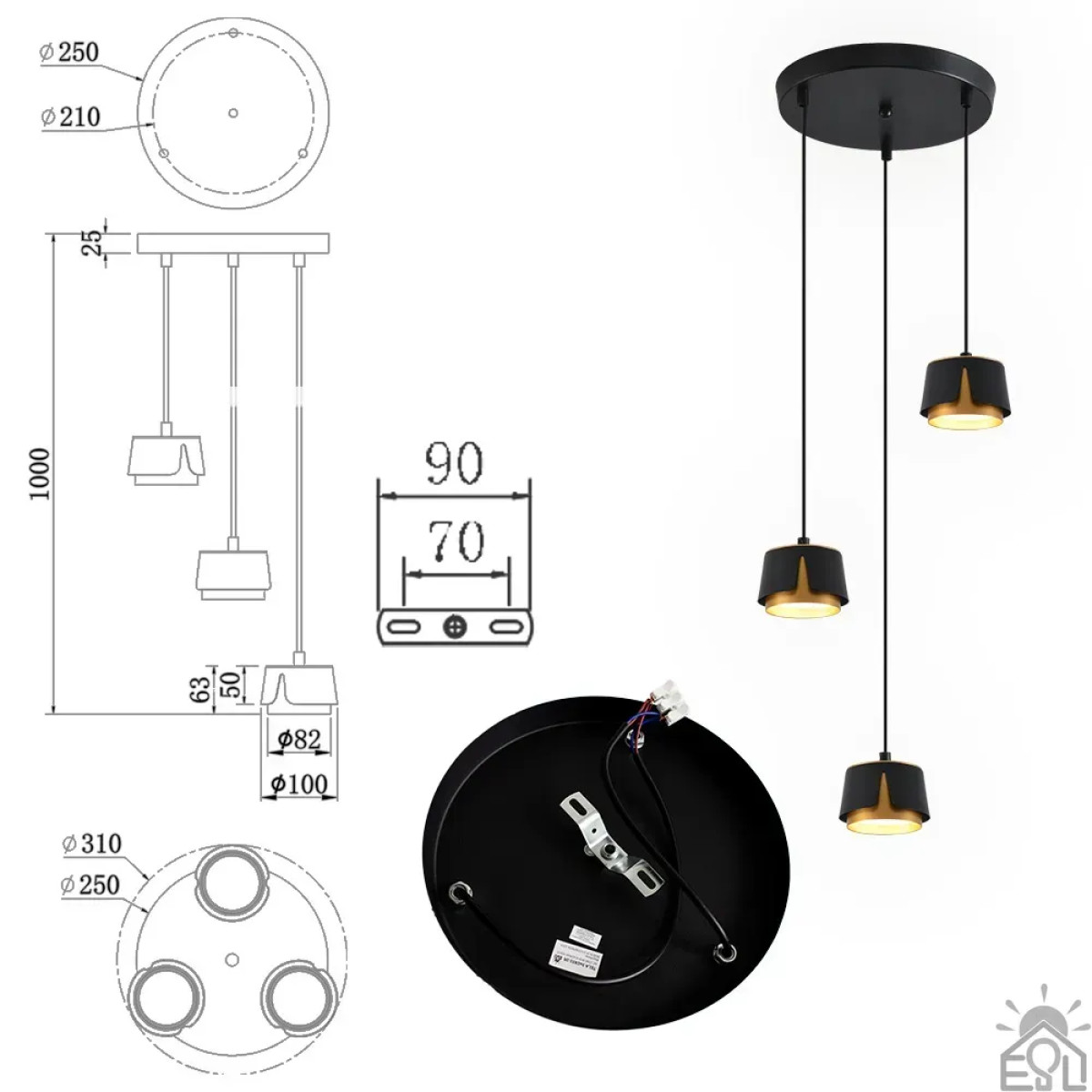 Світильник підвісний TELA 3R 100x1000 мм Чорно-золотий на 3 лампи GX53 10537 ESLLSE